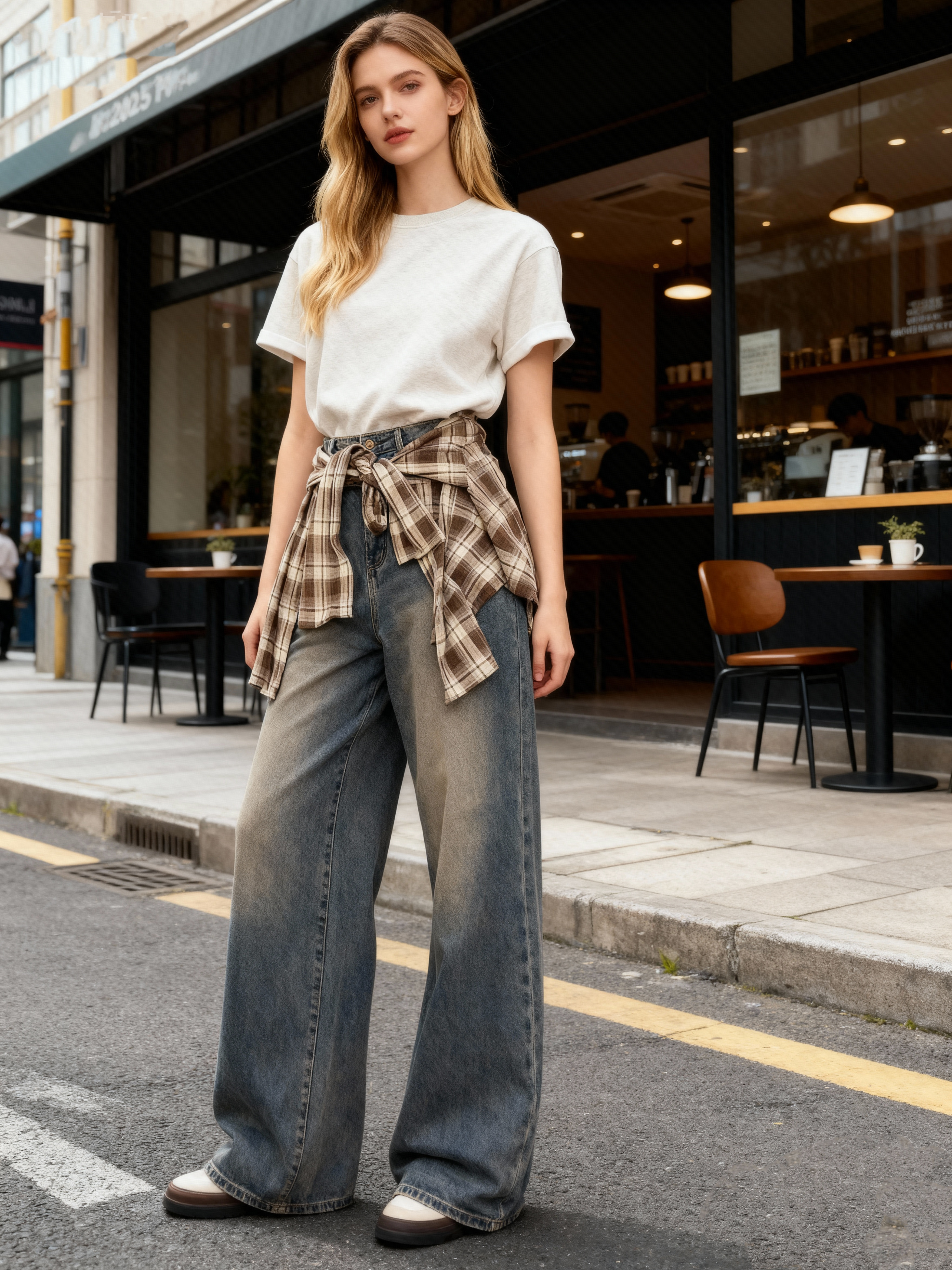 • Jeans a gamba larga:linea morbida,vita alta,stile vintage con lavaggio leggermente scolorito。