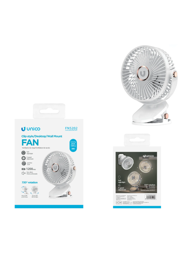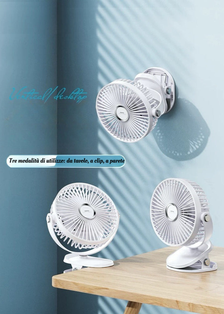 Scopri il nostro [nome del prodotto], progettato per offrire massima flessibilità e comfort. Grazie alla sua struttura 3-in-1, puoi posizionarlo su un tavolo, fissarlo con una clip o montarlo a parete. La rotazione a 720° garantisce una distribuzione uniforme dell’aria, mentre il funzionamento ultra-silenzioso (meno di 20 dB) lo rende ideale per ambienti domestici o uffici. L’illuminazione LED integrata aggiunge un tocco di praticità, permettendoti di utilizzarlo anche come lampada.