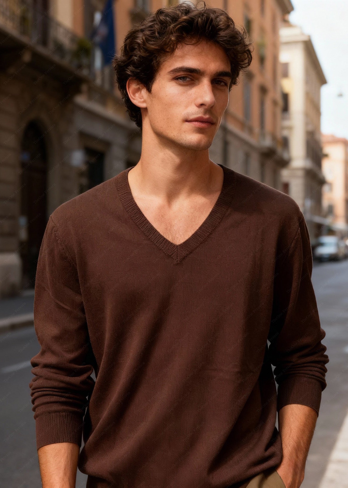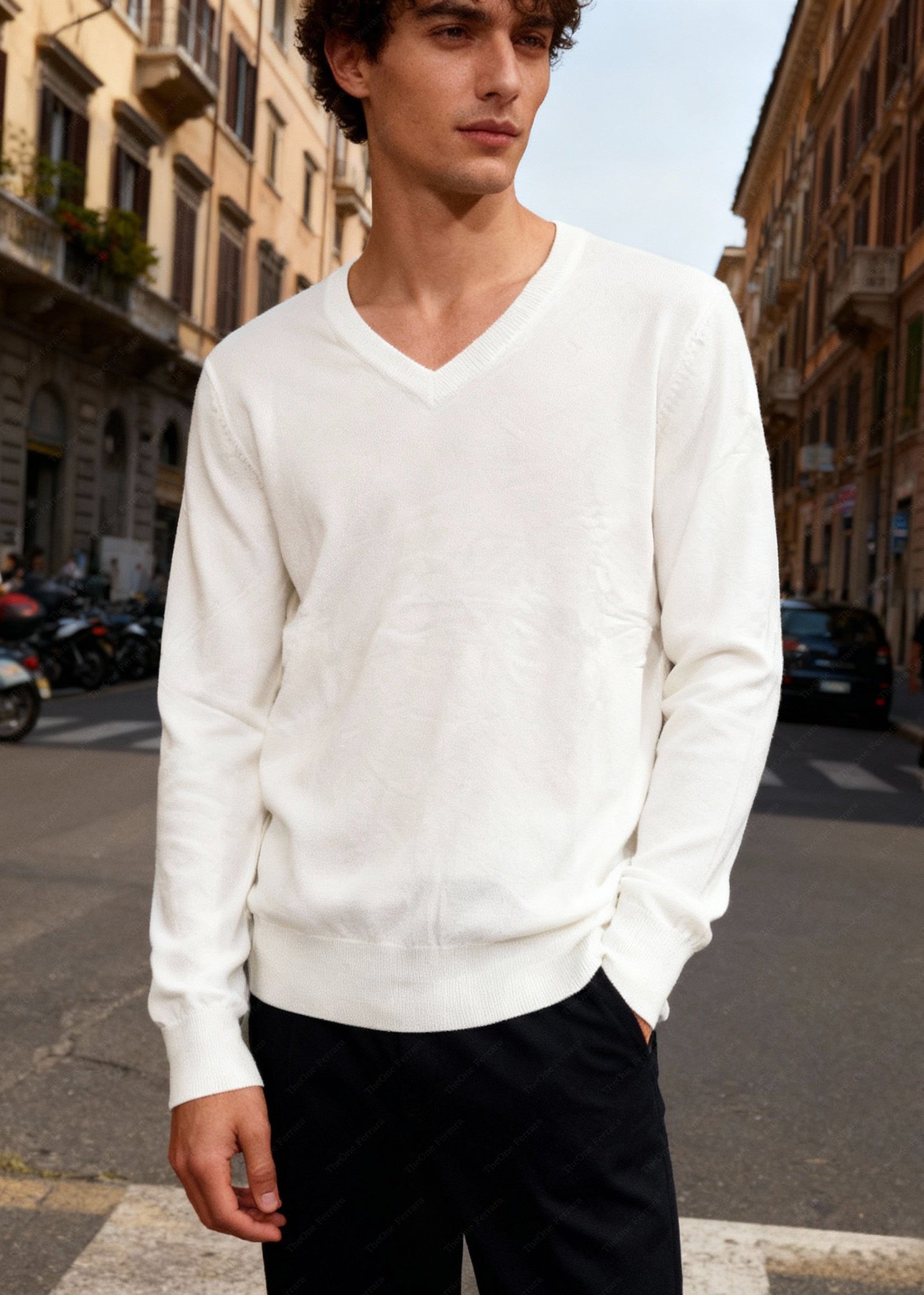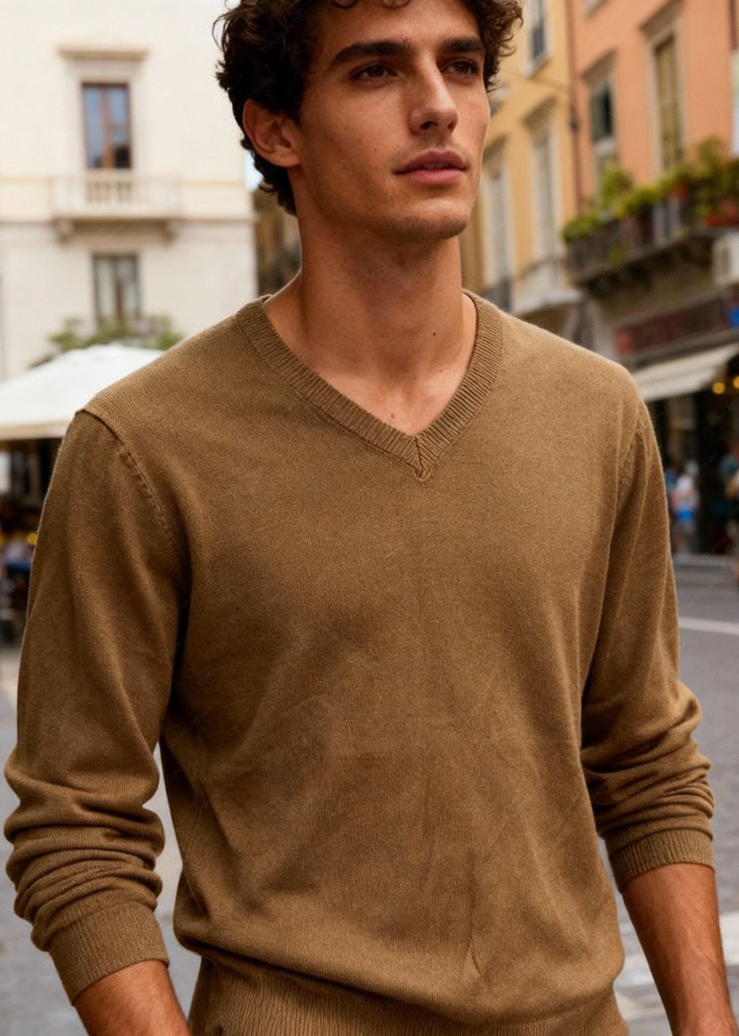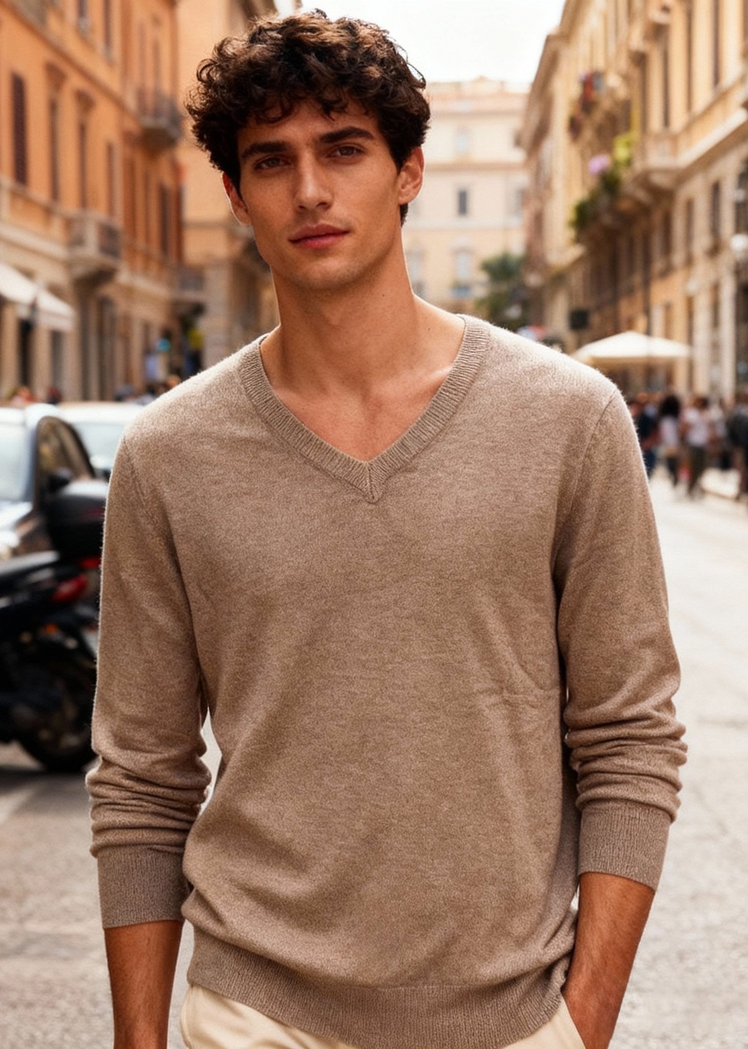 Questo maglione uomo con scollo a V è il capo essenziale per un guardaroba maschile moderno. Realizzato con una miscela premium di fibre naturali e sintetiche, offre comfort eccezionale, elasticità e stile raffinato per ogni stagione.