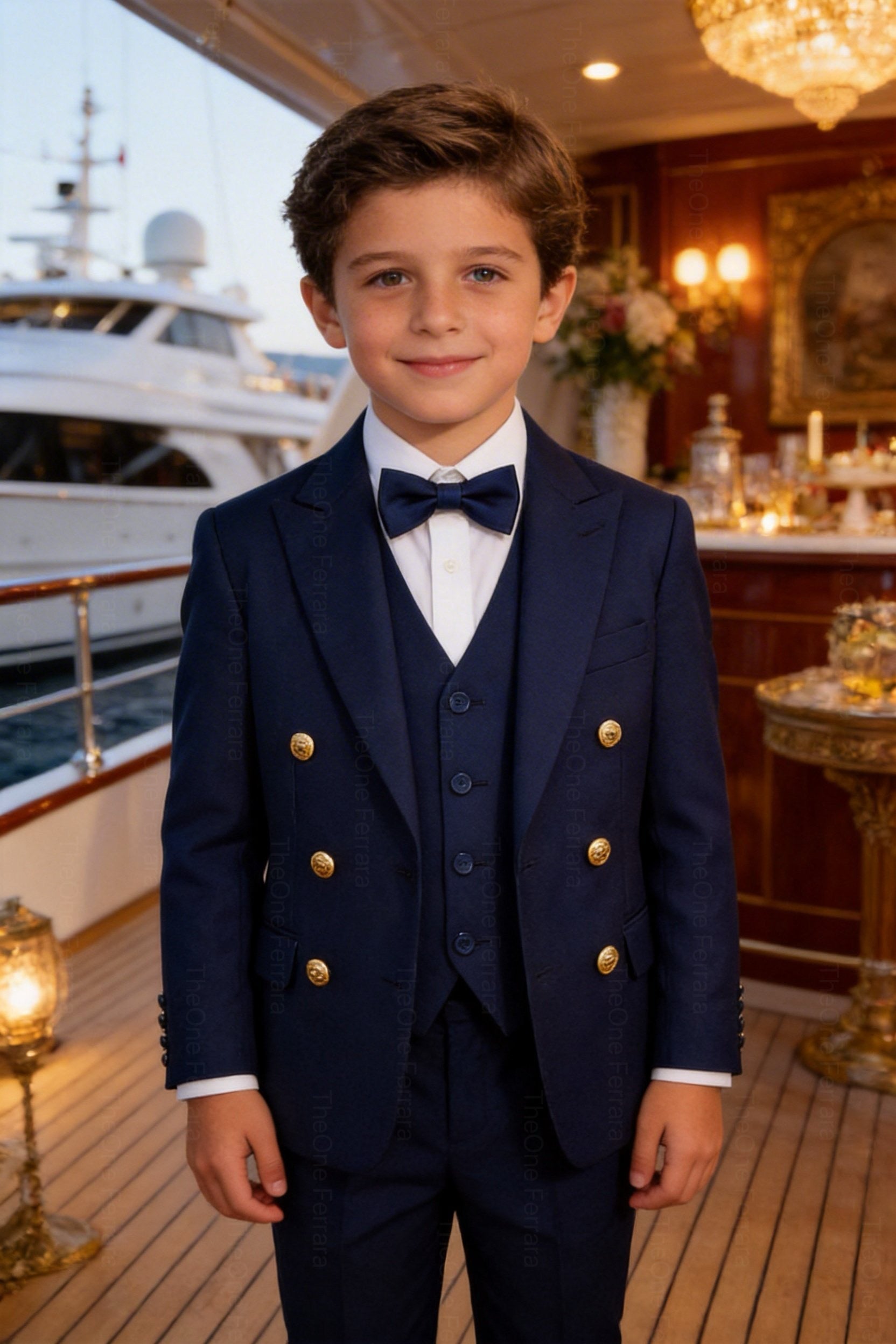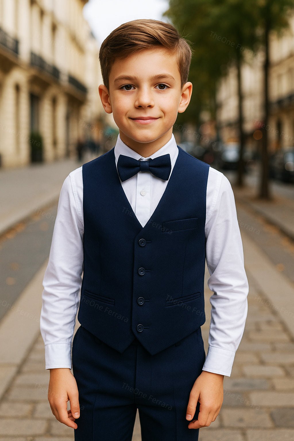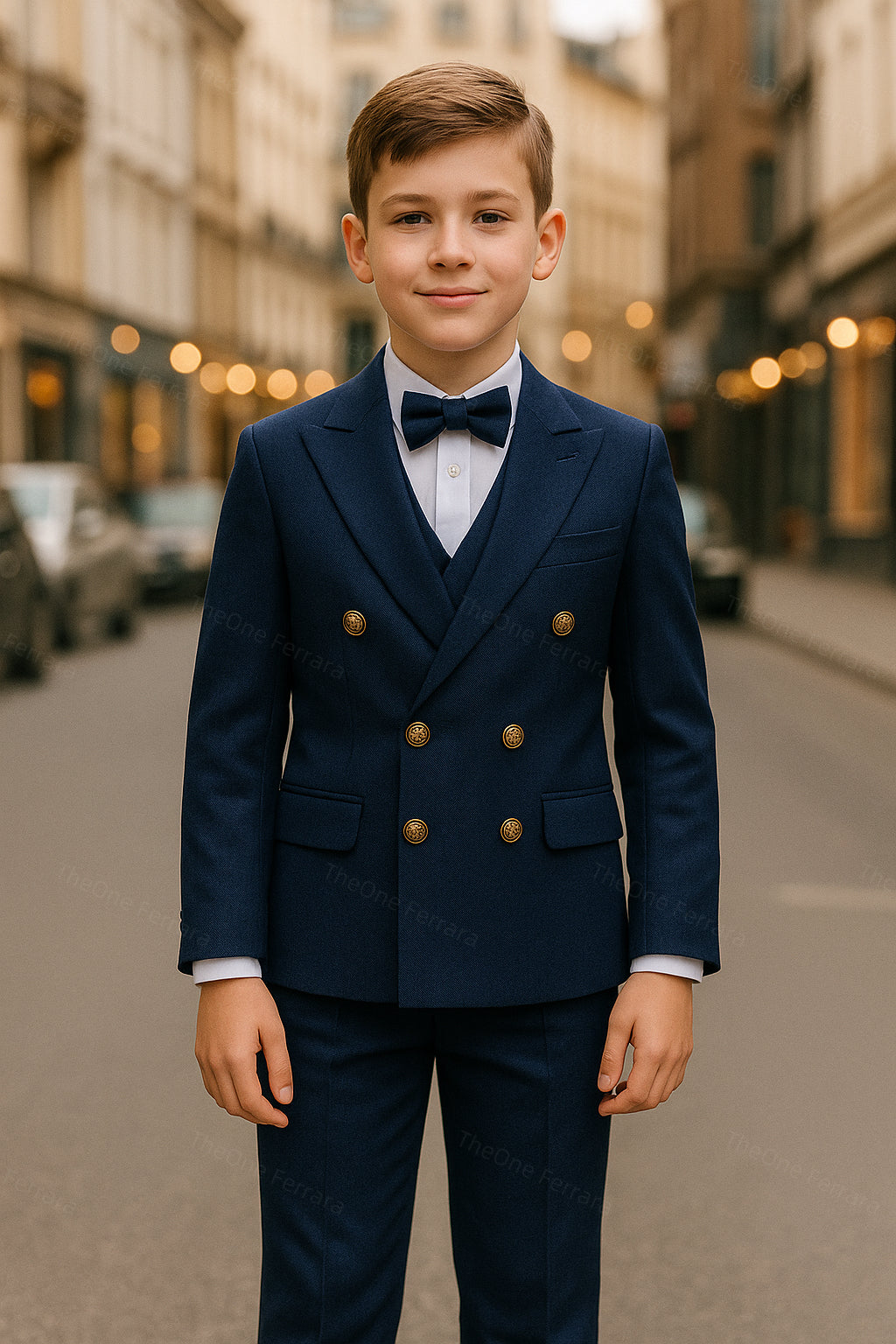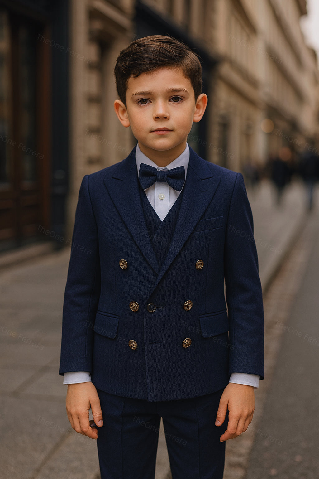 This refined tuxedo for boys aged 1–16 years includes a tailored jacket, a matching vest, a classic collared shirt, and a matching bow tie. The elegant and timeless design, inspired by Italian style, makes this suit perfect for the most important occasions.