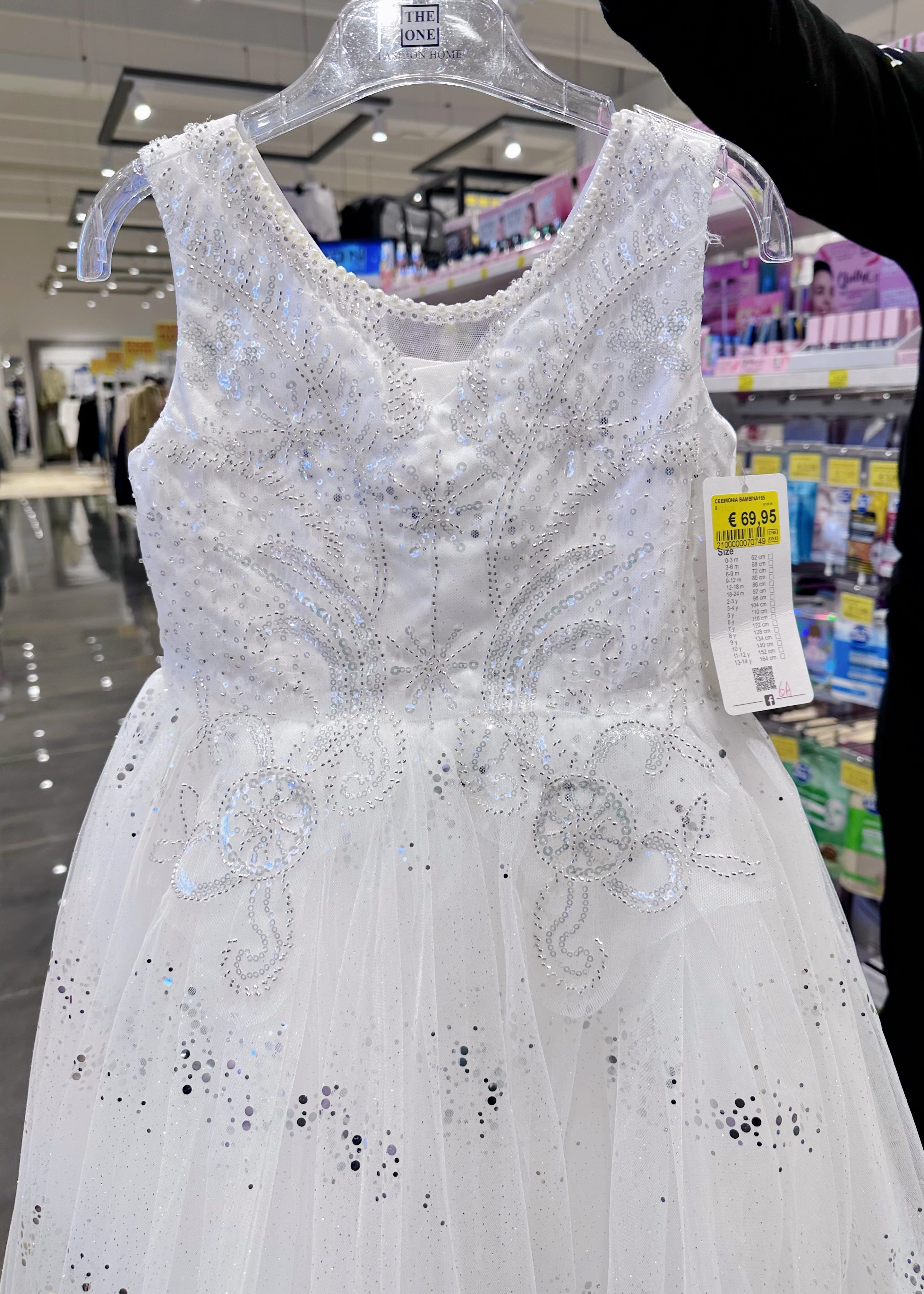 Questo splendido abito bianco da principessa è impreziosito da ricami con paillettes scintillanti, abbinati a una gonna vaporosa in tulle decorata con dettagli luminosi. Il taglio con scollatura a V e vita sagomata esalta la silhouette con grazia, rendendolo perfetto per matrimoni, compleanni e feste da favola!