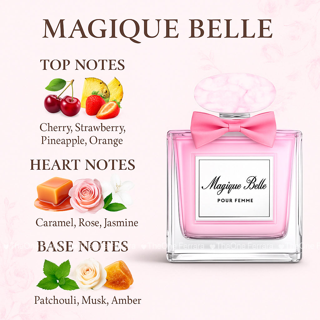 Scopri la magia del profumo Magique Belle, una fragranza incantevole che esprime femminilità, eleganza e dolcezza in ogni spruzzo.