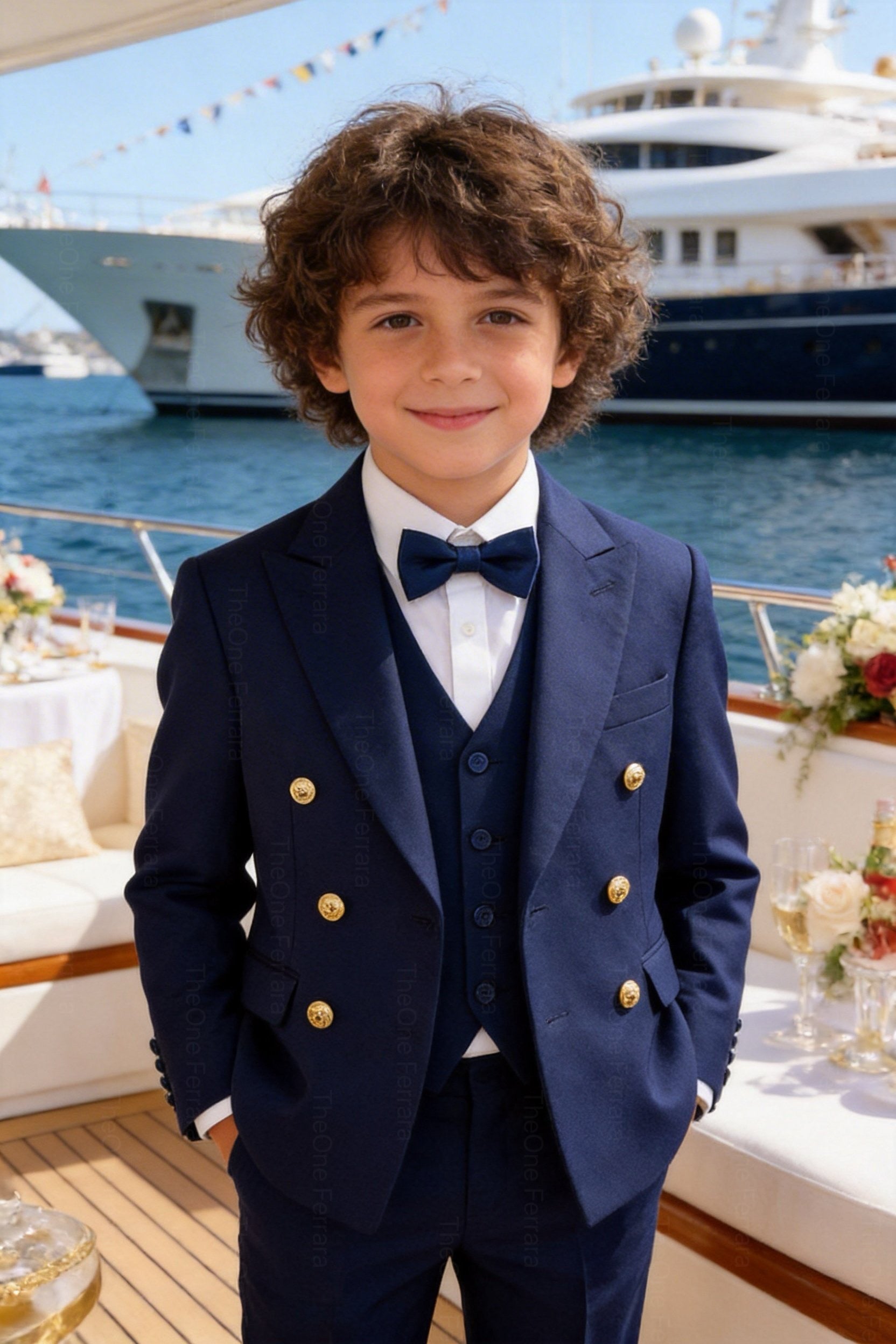 This refined tuxedo for boys aged 1–16 years includes a tailored jacket, a matching vest, a classic collared shirt, and a matching bow tie. The elegant and timeless design, inspired by Italian style, makes this suit perfect for the most important occasions.