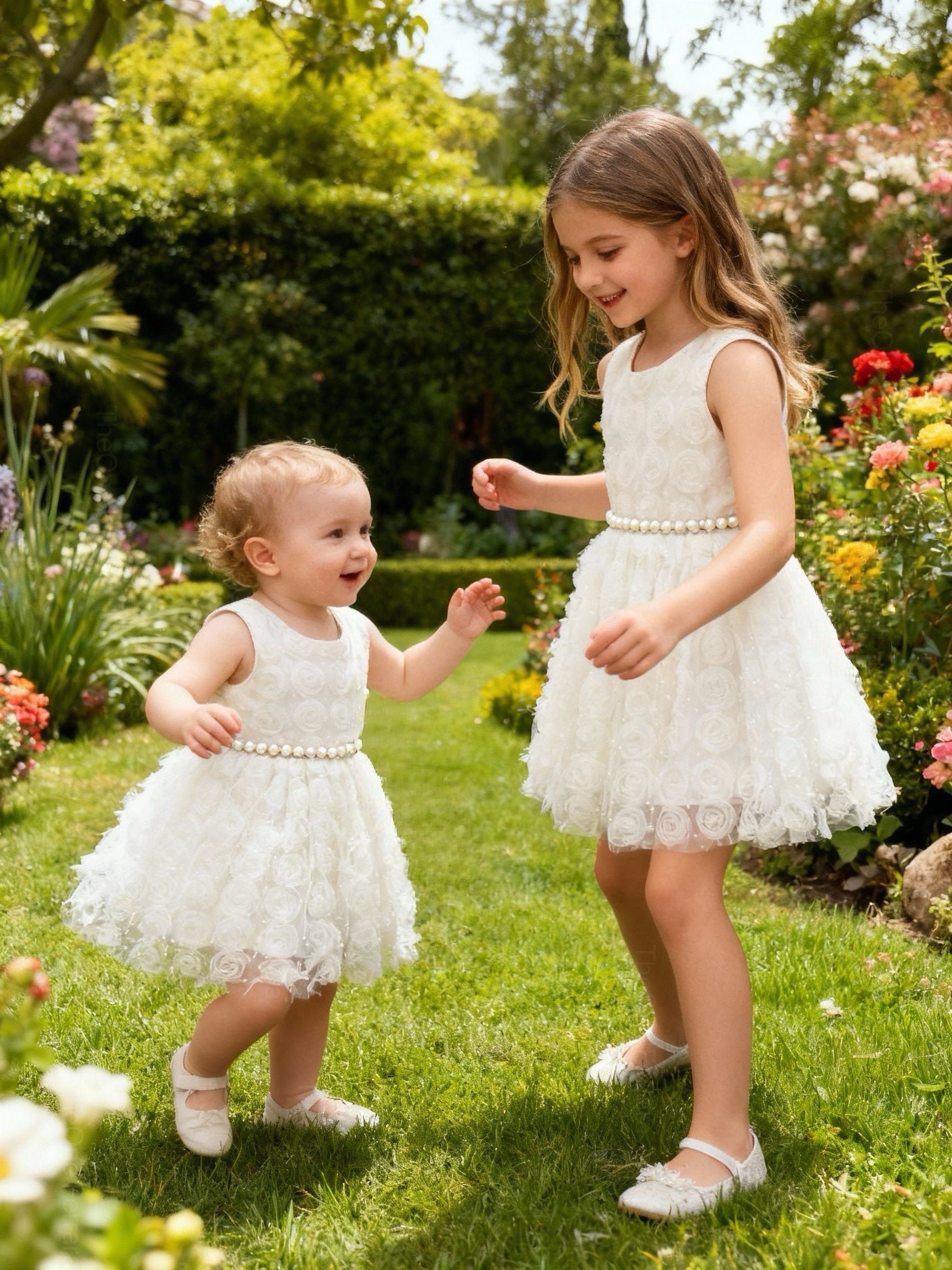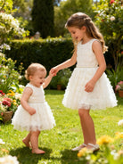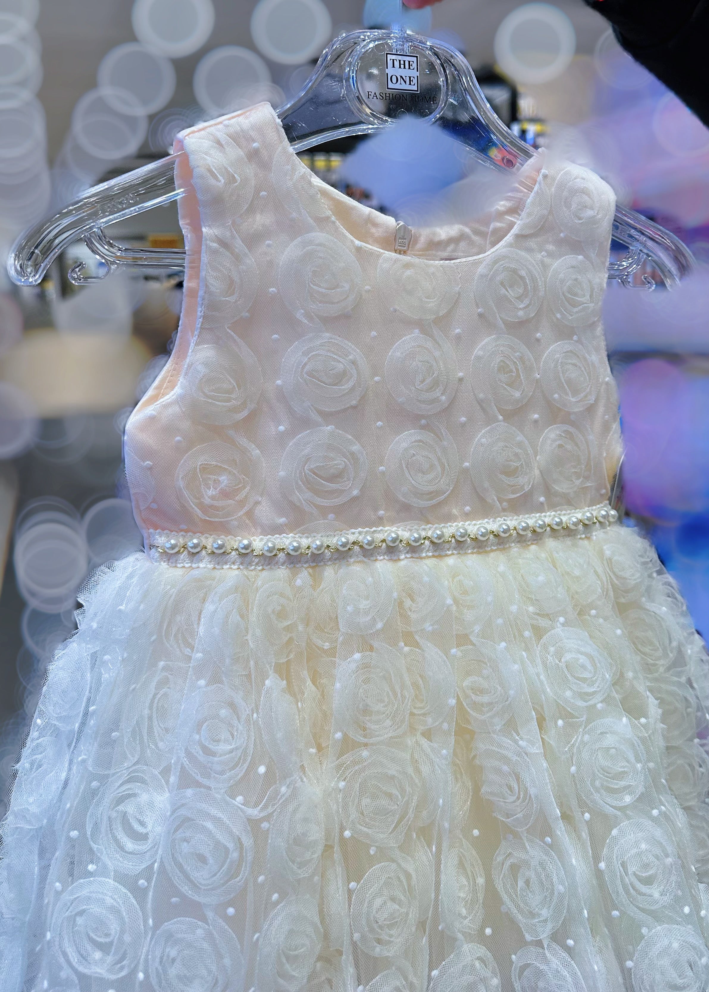 Elegant champagne-colored princess dress, crafted from embroidered lace with delicate floral motifs and pearl embellishments. The multi-layered tulle skirt is light and airy, perfect for baptisms, weddings, birthdays, and photo shoots.