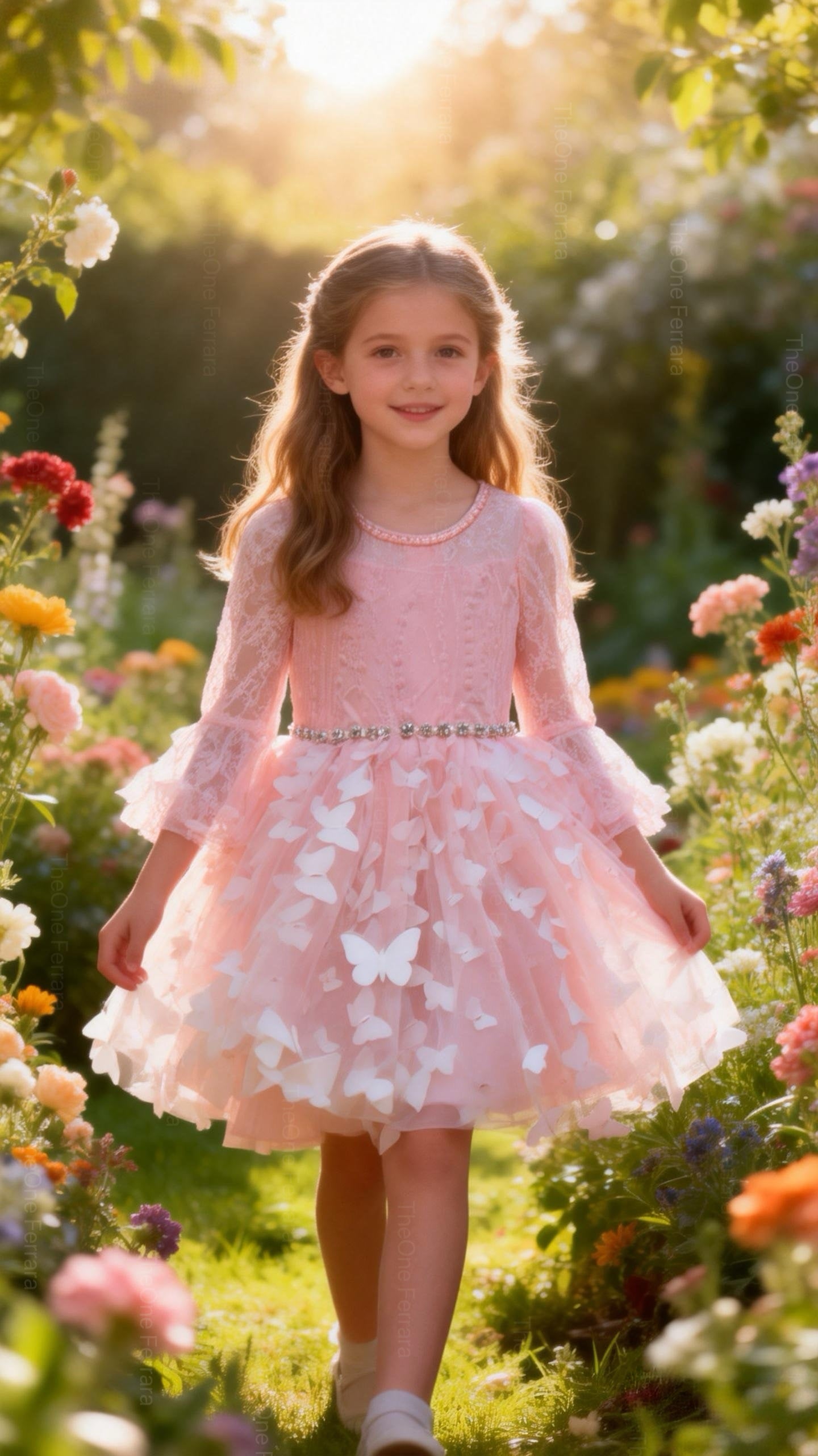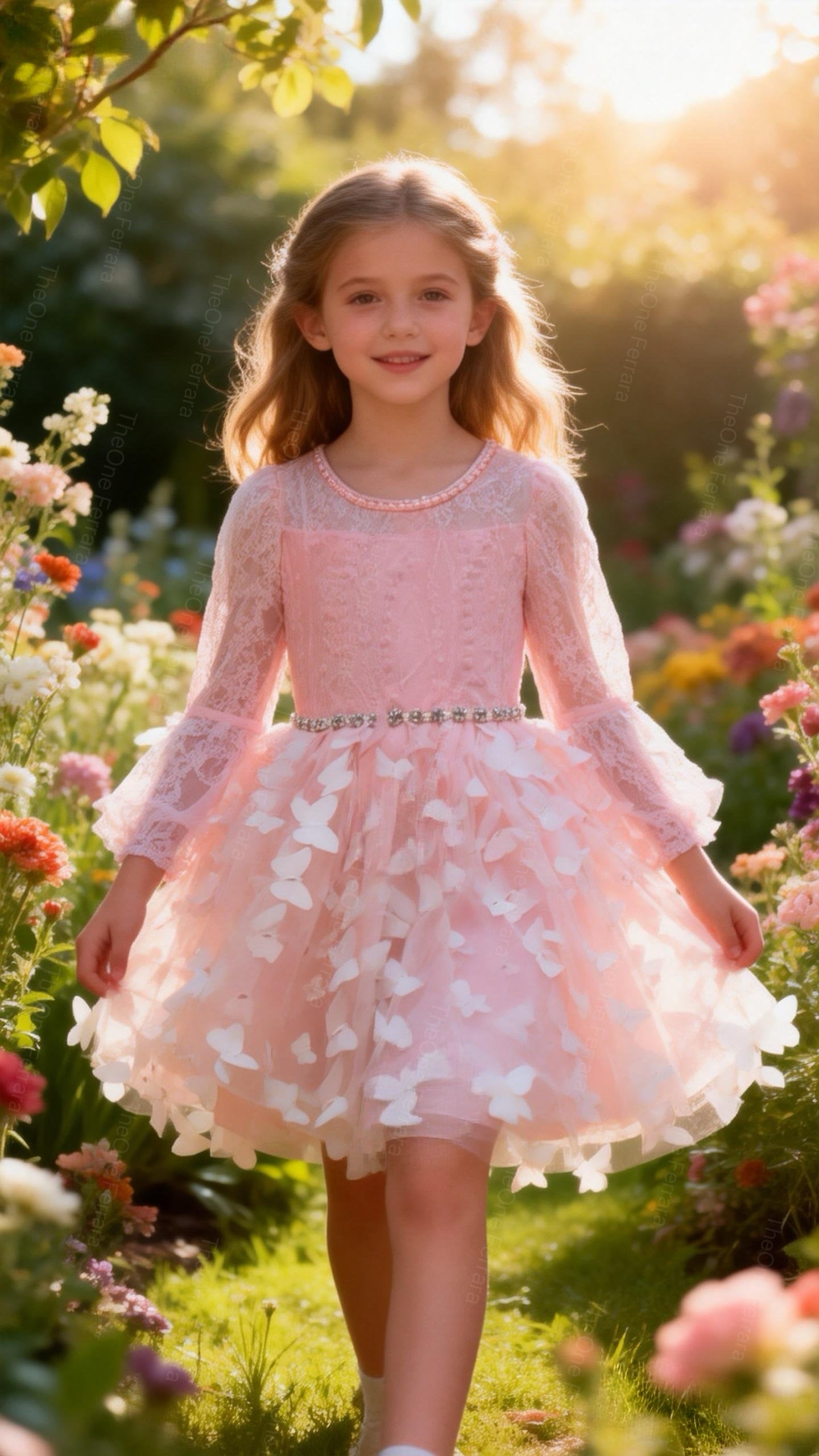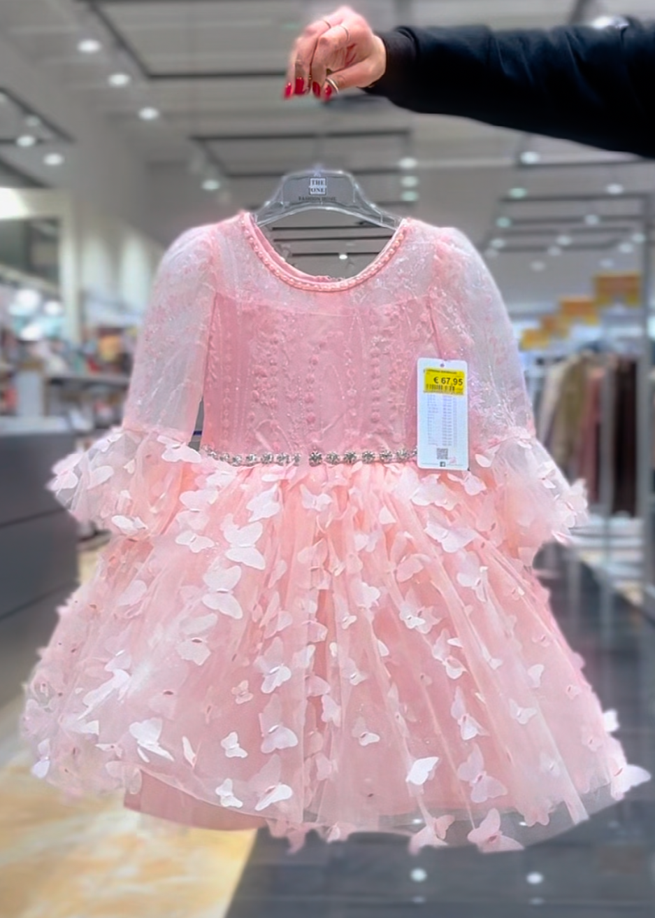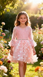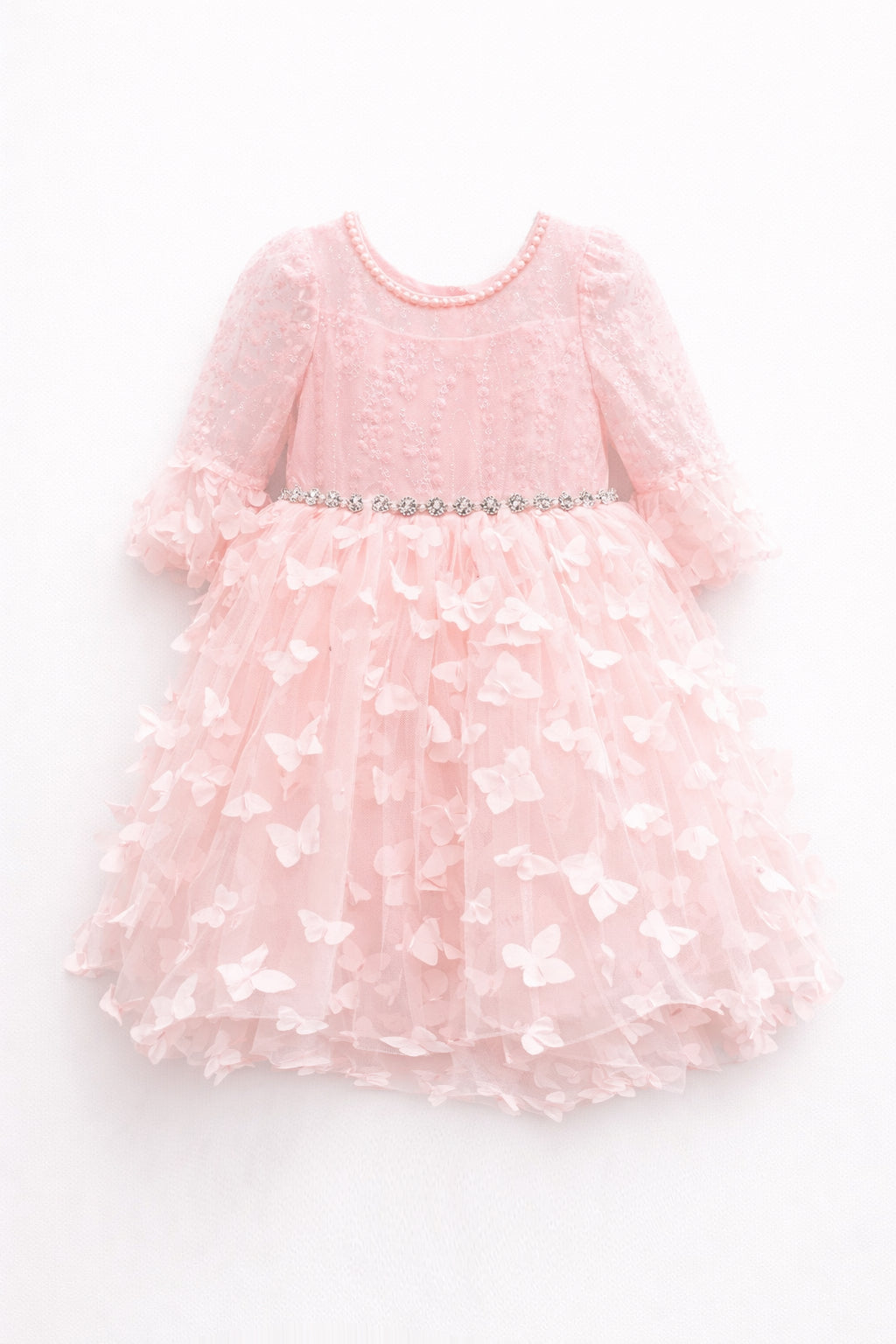 An enchanting pink princess dress, decorated with delicate lace details and 3D butterflies, perfect for creating a fairytale and refined look. The design with a flowing skirt and sparkling belt makes it ideal for birthdays, weddings, and special occasions.