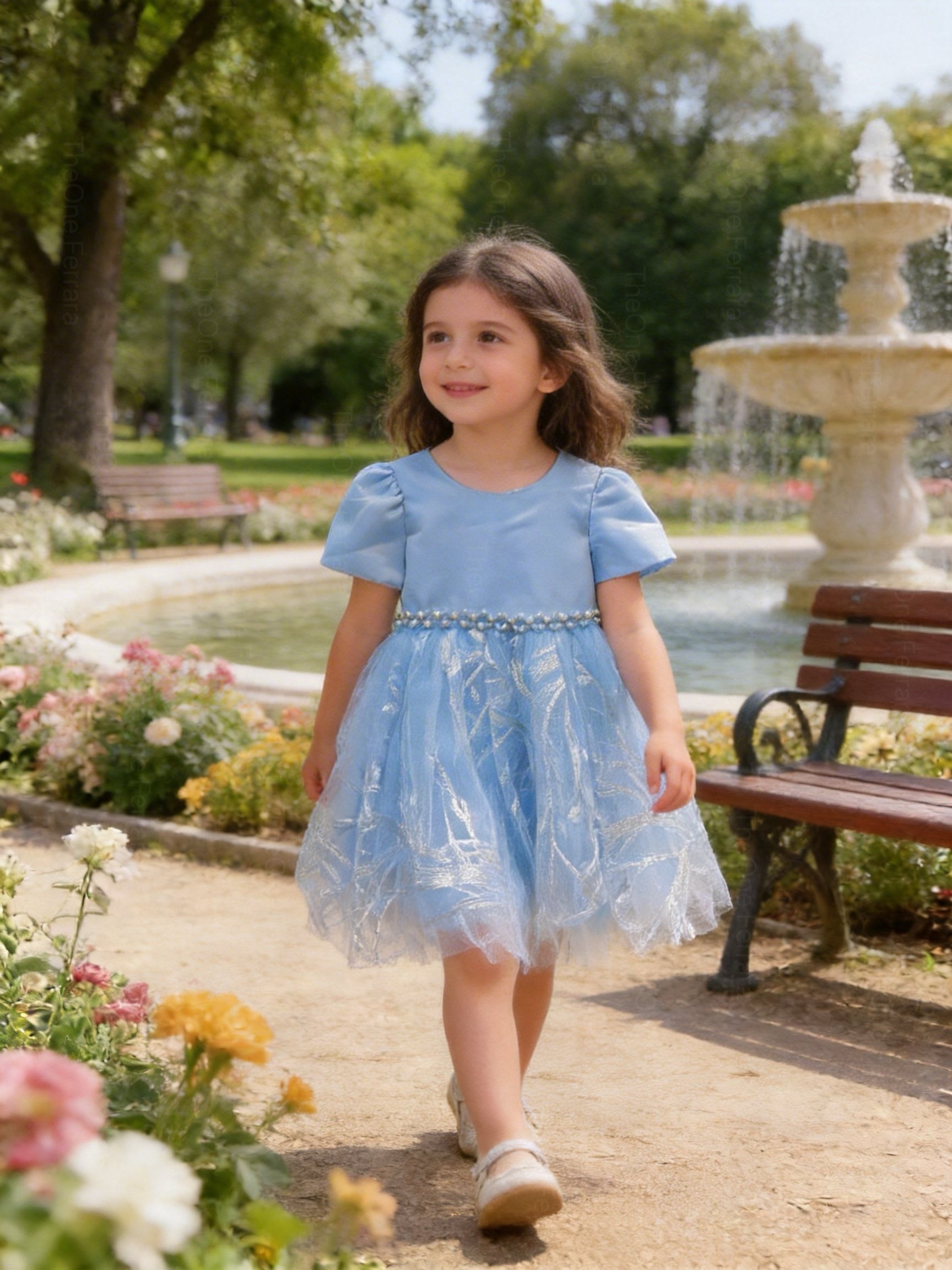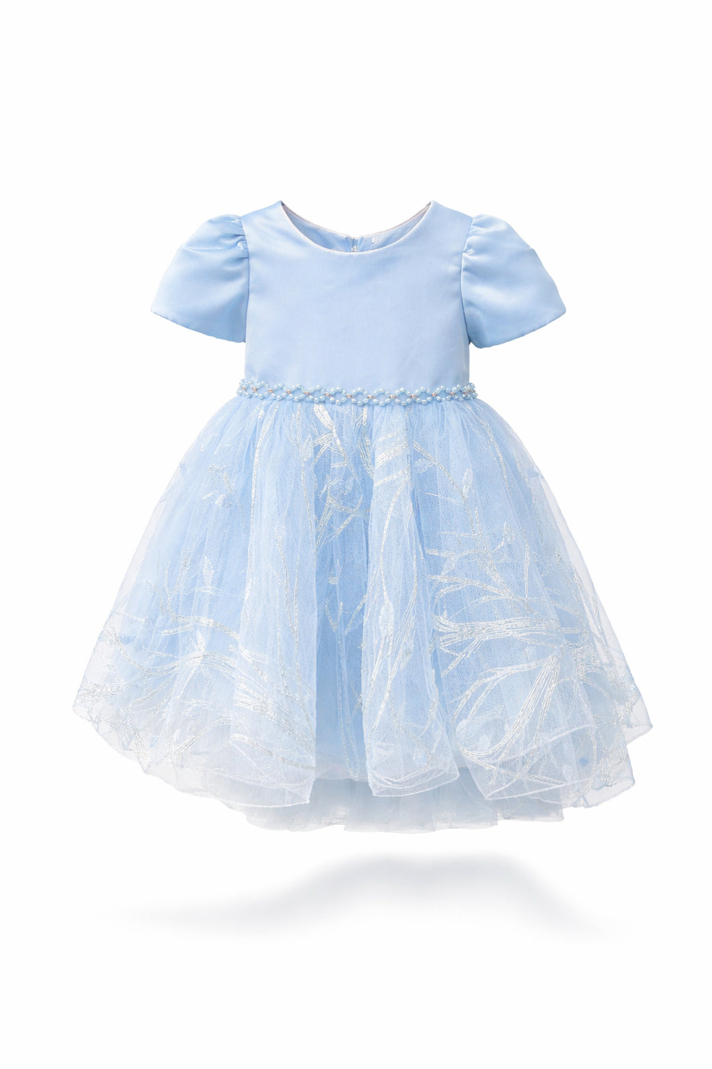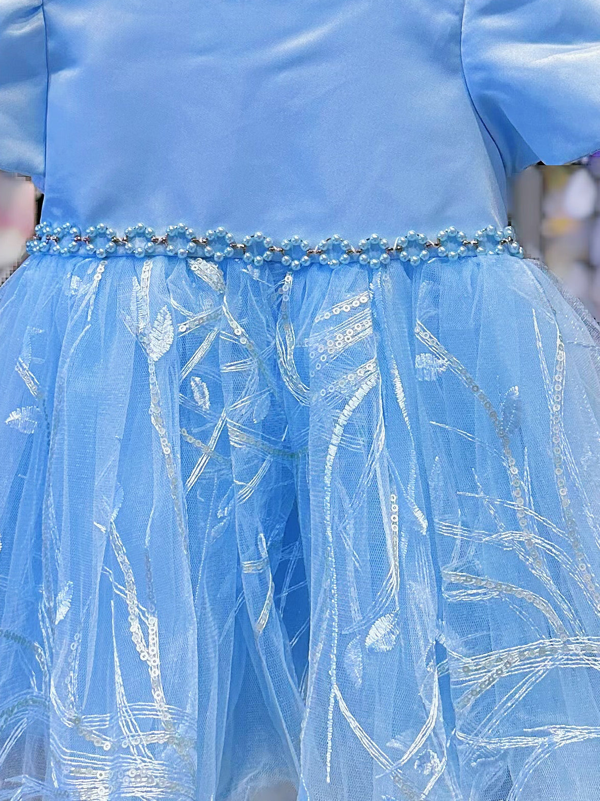 Questo vestito azzurro per bambina è ispirato a uno stile fiabesco, con maniche a sbuffo, corpetto satinato e una gonna in tulle ricamato con foglie argentate che brilla ad ogni passo. Un’elegante cintura decorata con perline blu e bianche esalta la silhouette e aggiunge un tocco di classe.