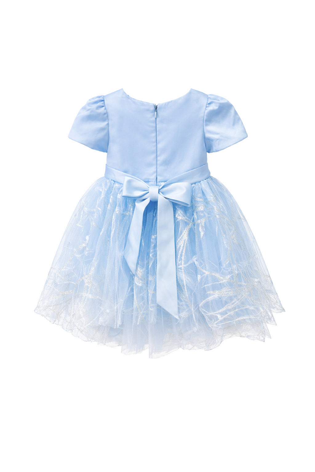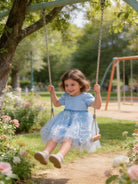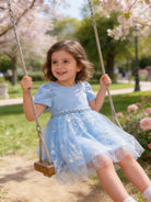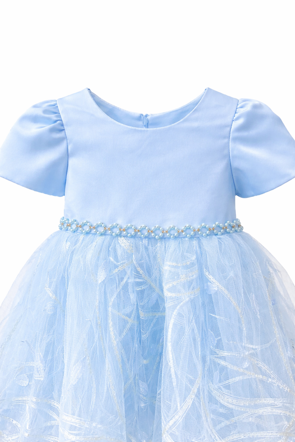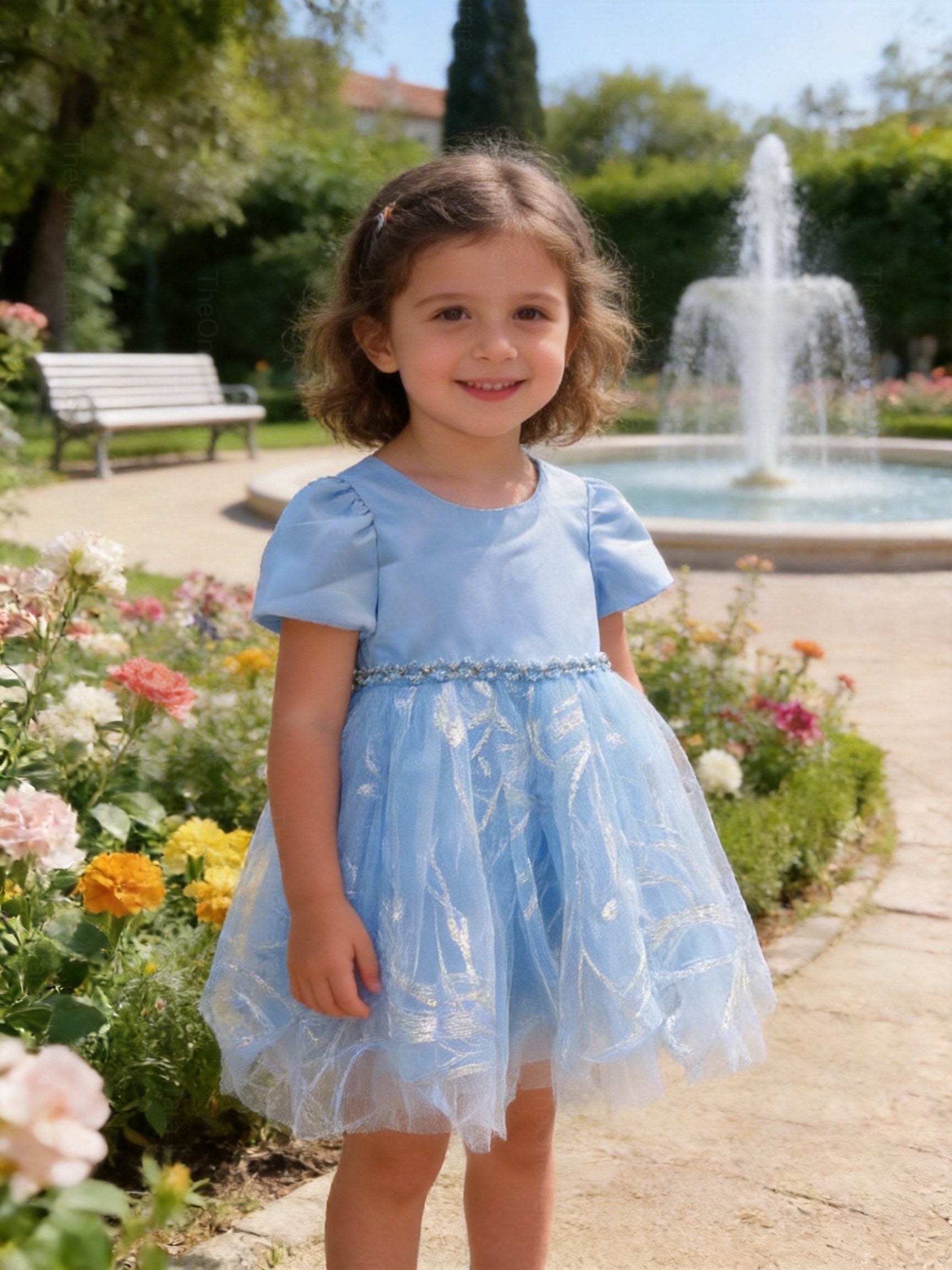 Questo vestito azzurro per bambina è ispirato a uno stile fiabesco, con maniche a sbuffo, corpetto satinato e una gonna in tulle ricamato con foglie argentate che brilla ad ogni passo. Un’elegante cintura decorata con perline blu e bianche esalta la silhouette e aggiunge un tocco di classe.