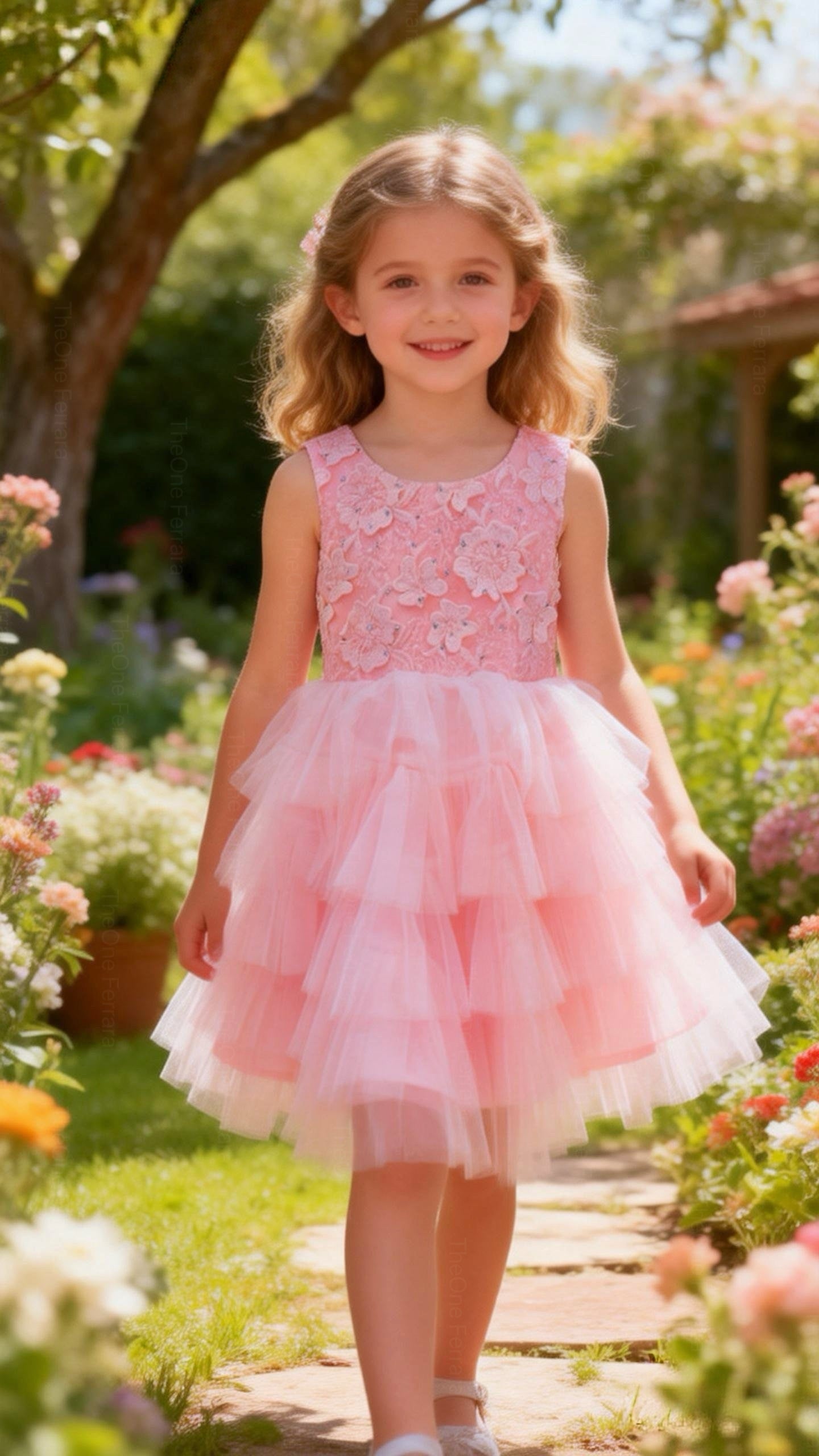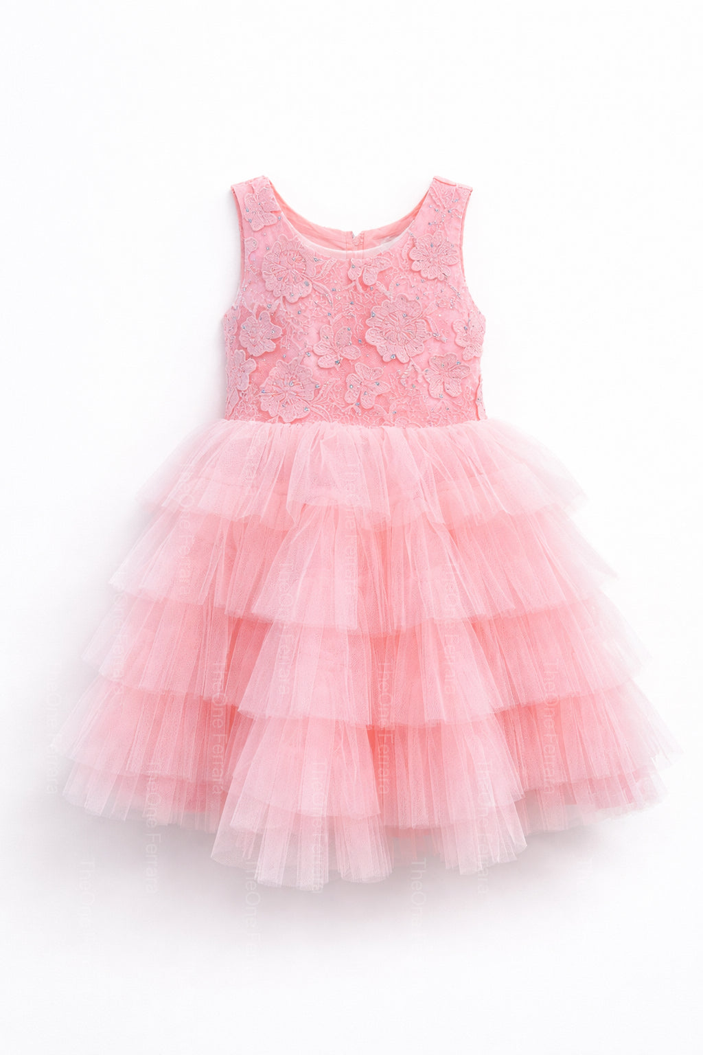 Abito Cerimonia Bambina Rosa Cipria con Tulle Multistrato e Dettagli Strass 2–14 Anni -TheOne