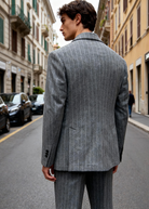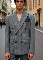 Quando un uomo abbottona una giacca doppiopetto, non sta semplicemente vestendosi — sta dichiarando la sua sovranità. Il gessato azzurro-grigio, come le linee sulla tavola di un architetto, preciso, elegante, pieno di forza. Questa non è una giacca qualunque, questa è l'armatura creata da Di Lorenzo Sartoria Italiana per chi comanda.