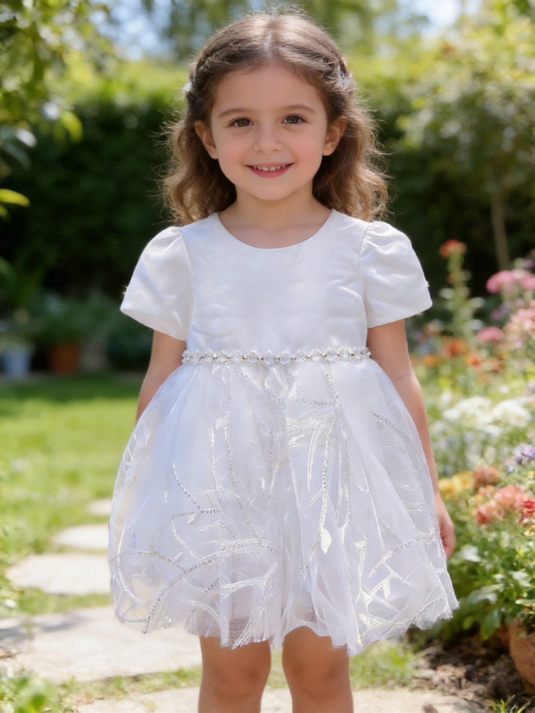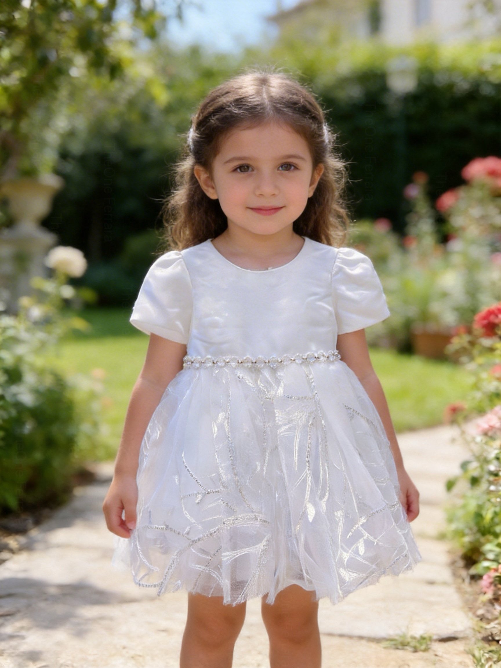 Questo vestito bianco da bambina è perfetto per battesimi, prime comunioni, matrimoni come damigella o feste eleganti. Il design include maniche a sbuffo, un corpetto semplice in satin, cintura con perline bianche e dorate, e una gonna in tulle ricamato con motivi a foglia dorati e argentati.