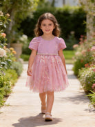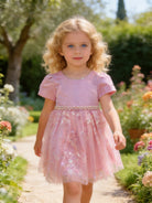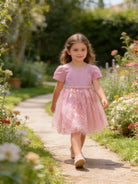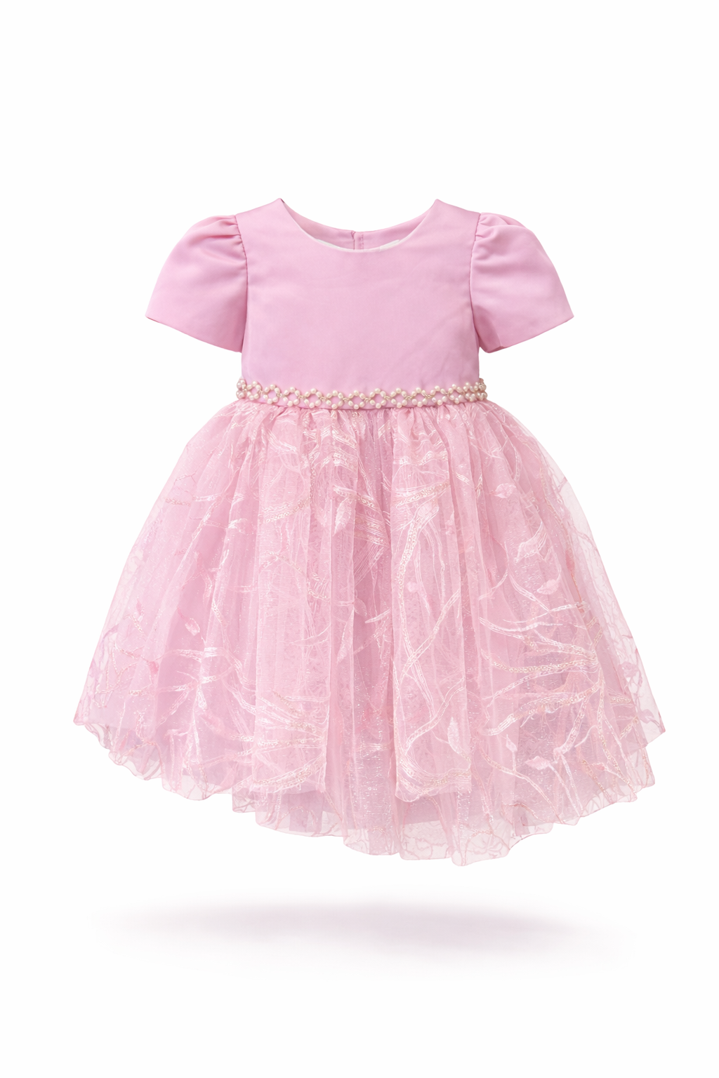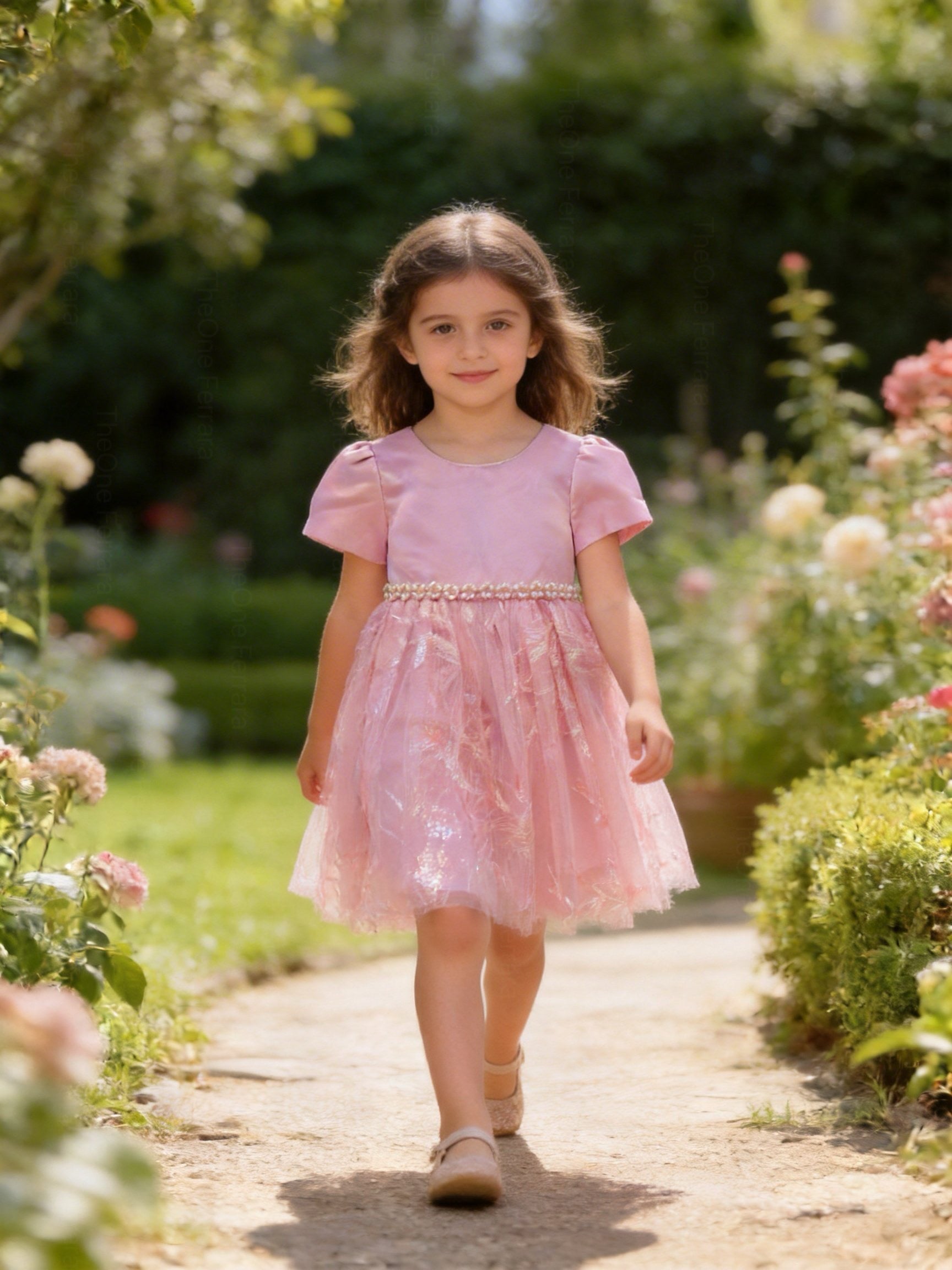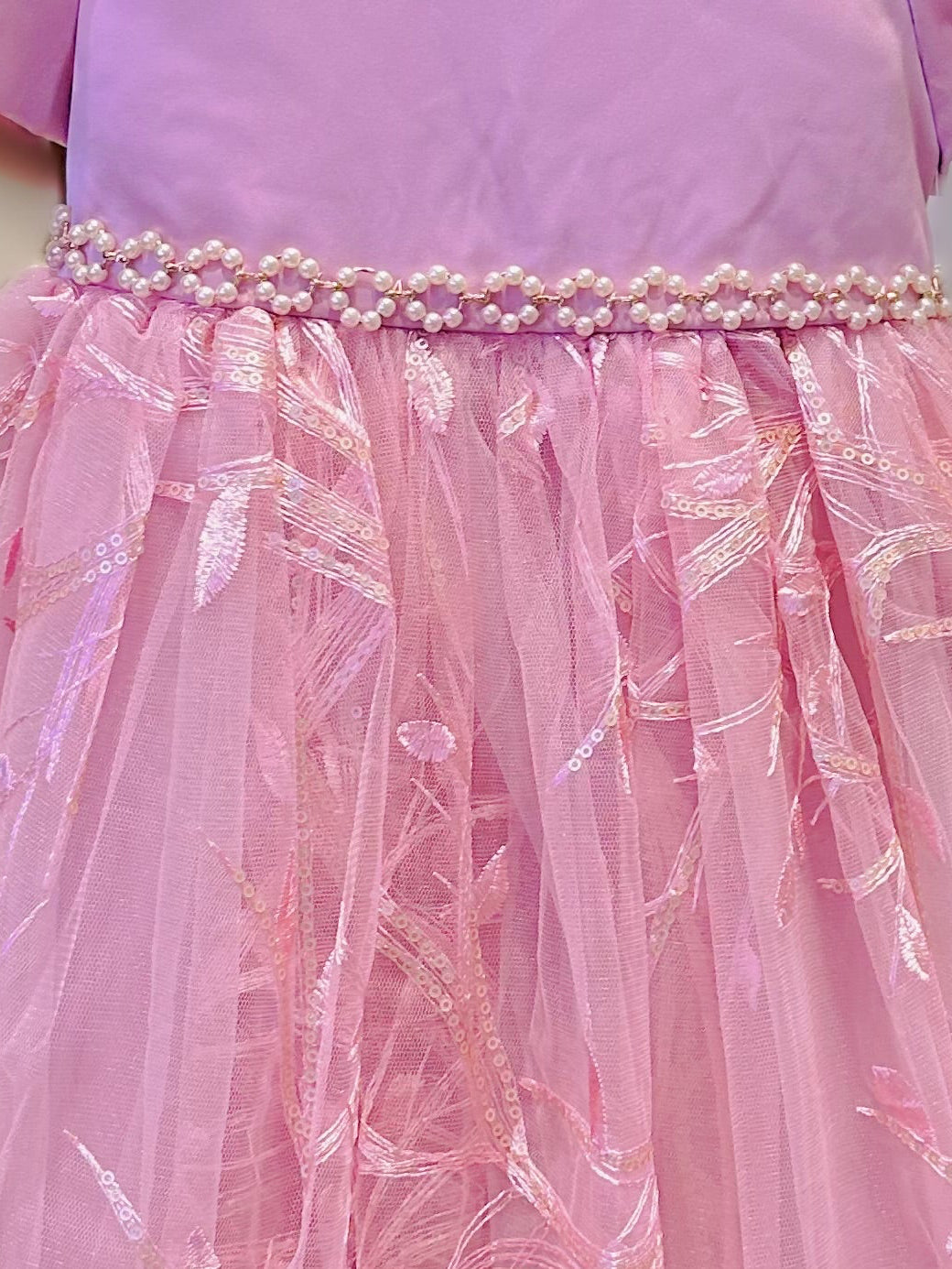 Questo vestito lilla da bambina unisce semplicità e fascino: il corpetto in tinta unita è impreziosito da una cintura di perline, mentre la gonna in tulle rosa con ricami scintillanti dona volume e magia a ogni passo.